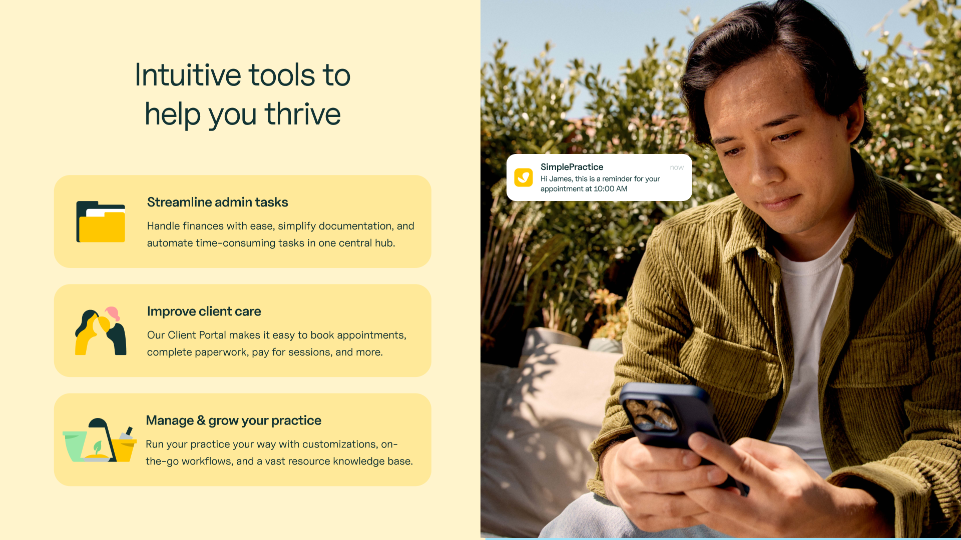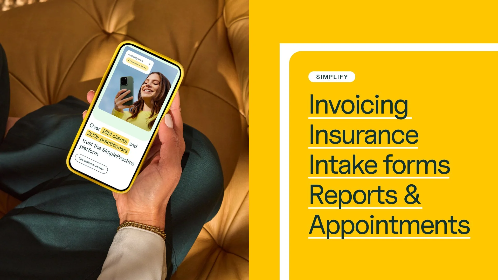 SimplePractice is the trusted solution for people who are driven to help others or themselves by simplifying their world, so they can focus on giving and receiving quality care.